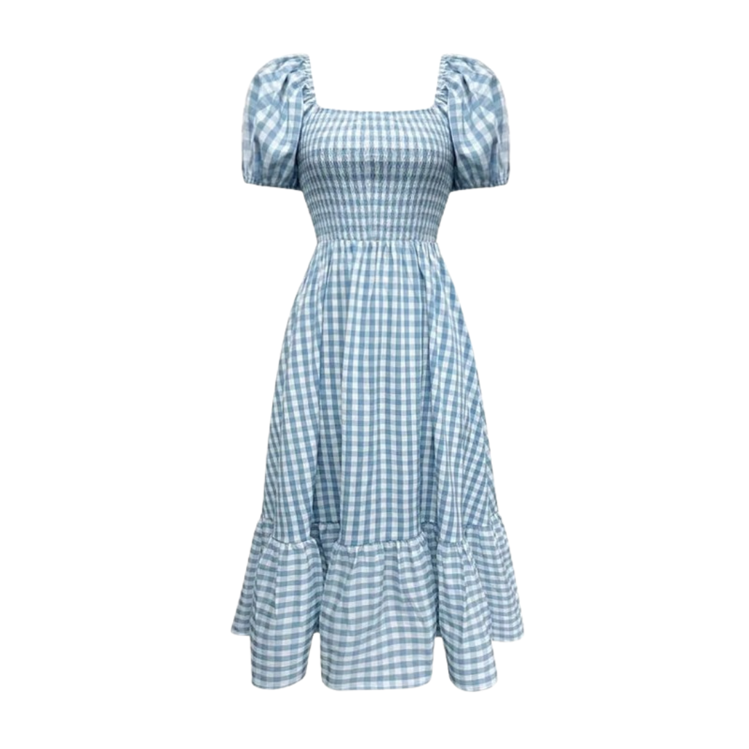 Embrace the season in this elegant bohemian spring dress designed with a flattering waist-cinching silhouette and soft flowing movement. The puff sleeves and ruffle hem make this blue plaid puff sleeve midi dress a graceful choice for concerts, city strolls, and unforgettable spring moments.