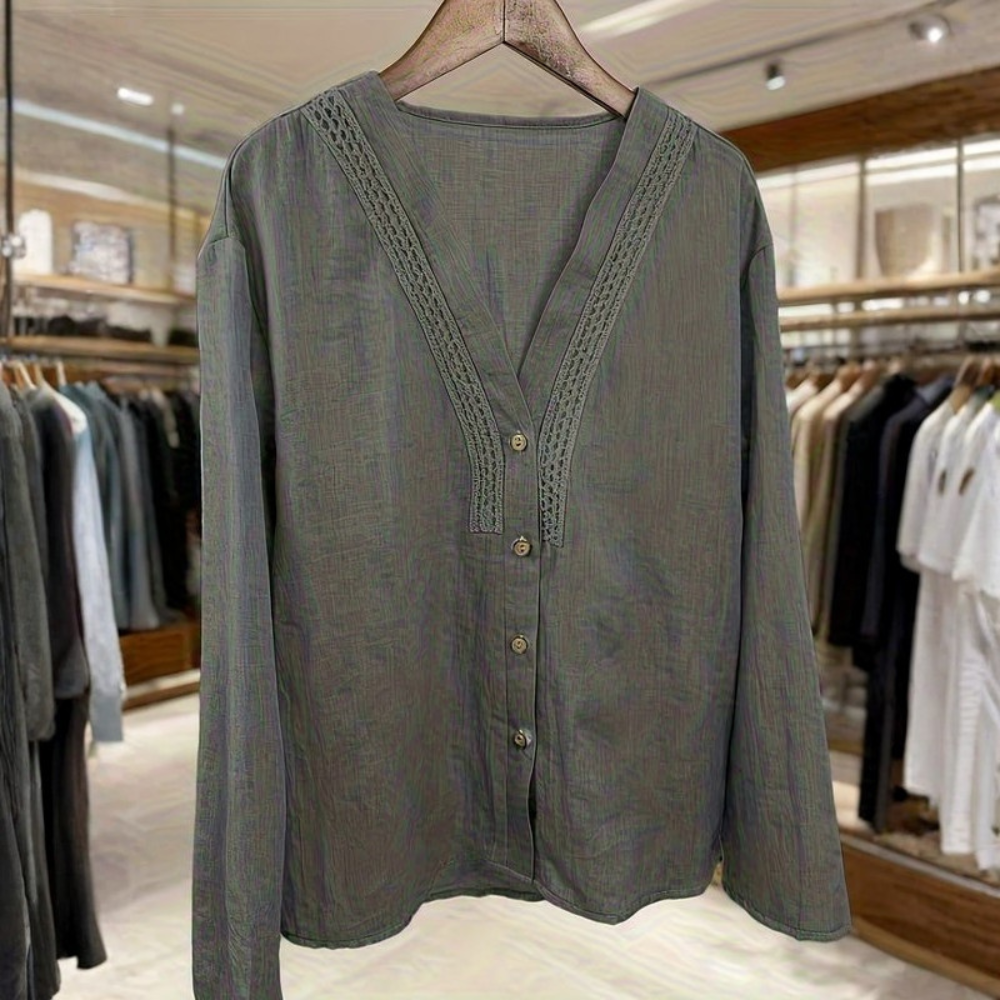 The Clara blouse is designed for women who love a free-spirited, laid-back look with timeless appeal. Featuring a flattering V-neckline, long sleeves, and a relaxed silhouette, this women’s bohemian casual blouse offers breathable comfort and easy styling, making it a versatile women’s everyday vacation blouse for spring and summer days.