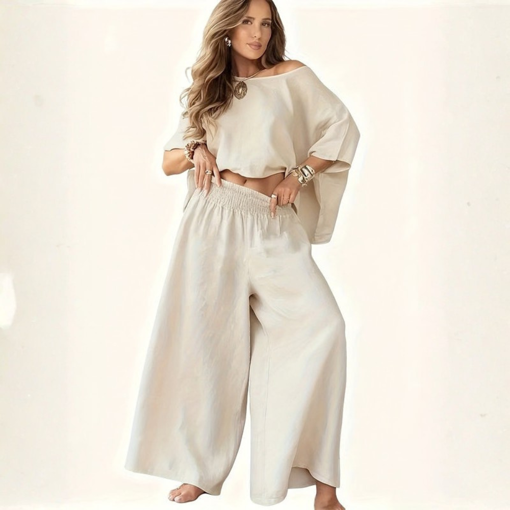 - Off-shoulder styling adds a relaxed edge to women’s casual two-piece sets