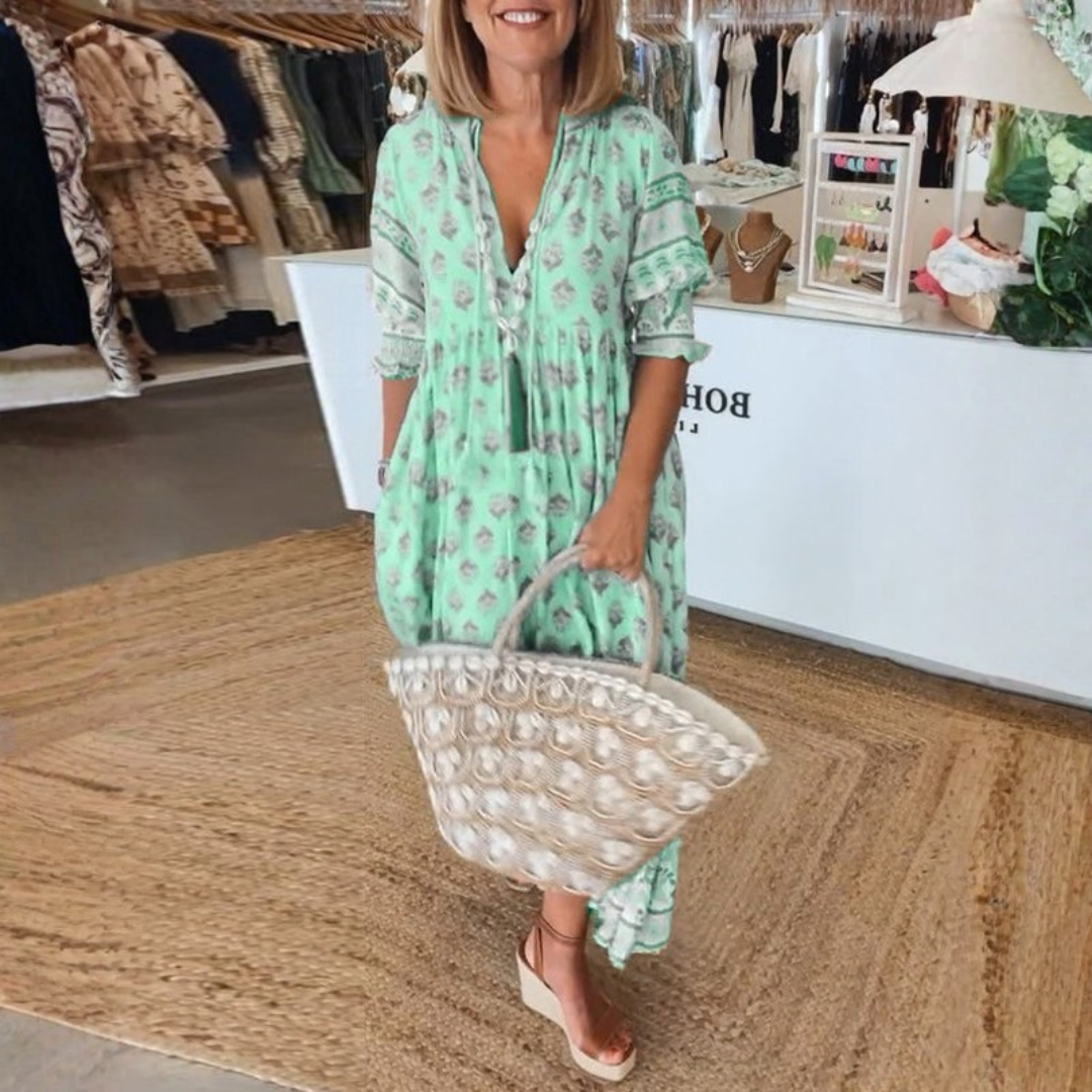 This printed V-neck midi dress captures a fresh and relaxed summer mood with its flowing silhouette and expressive design. Perfect for warm days, this women’s summer midi dress with print blends comfort, movement, and natural elegance for everyday outings and sunny escapes.