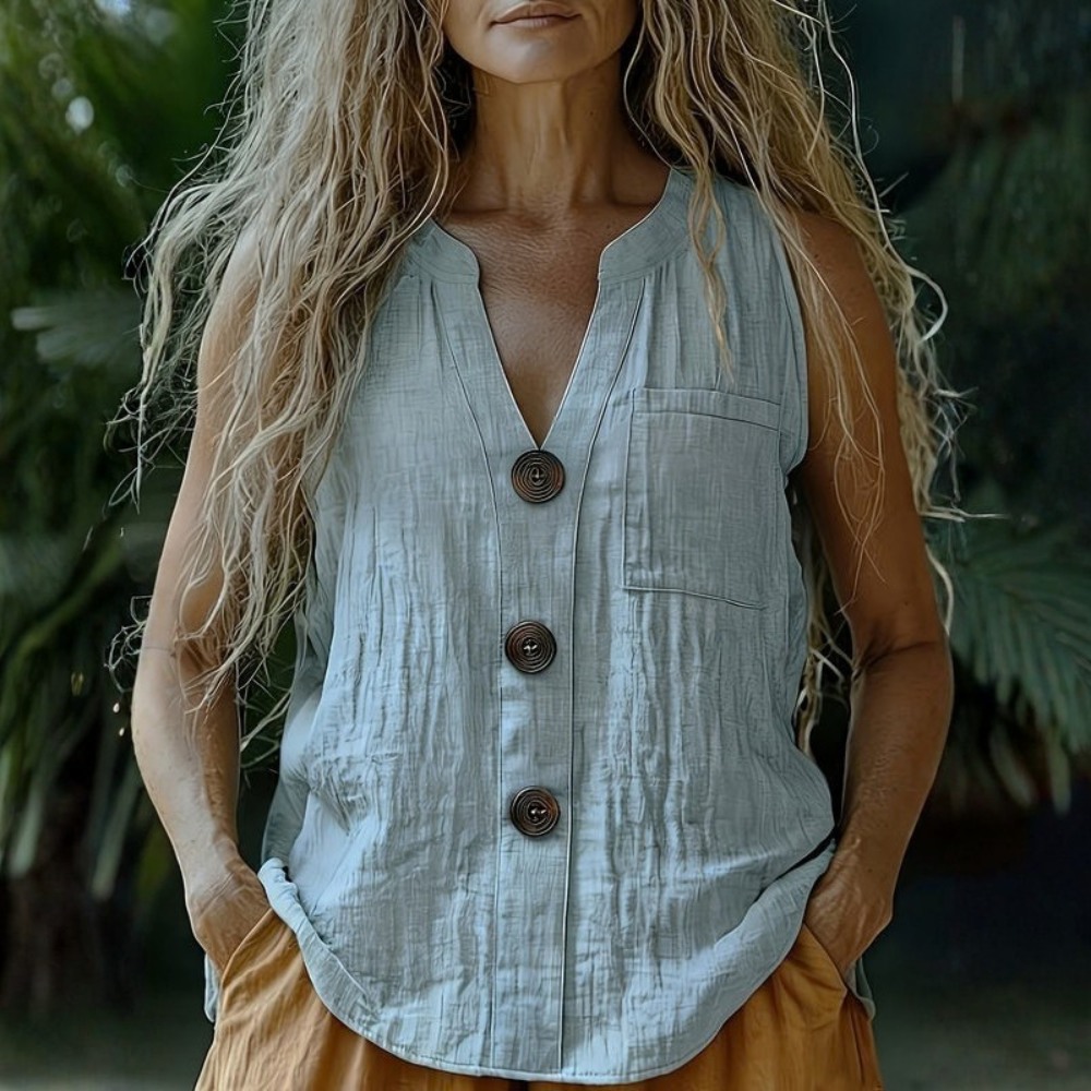 The Rachel top is designed for women who love elegant vacation style with a relaxed, flattering fit. Featuring a V-neckline with ethnic-inspired button detailing and a loose sleeveless silhouette, this women’s vintage vacation top delivers breathable comfort and timeless charm, making it a versatile women’s summer casual top for warm days and relaxed outings.